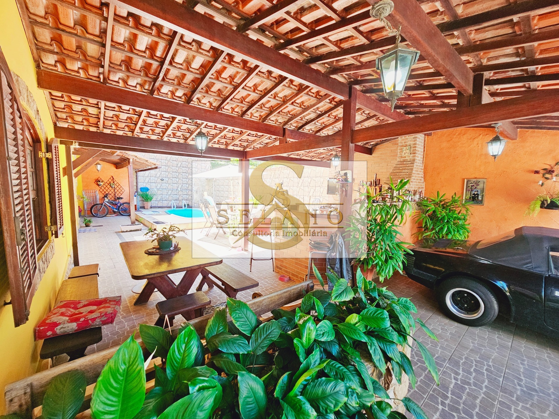 Este imóvel é composto por quintal com jardim e piscina, chuveirão, área gourmet com churrasqueira, varanda e garagem cobertas, banheiro de serviço na parte externa, lavanderia/ área de serviço externa, sala, cozinha e banheiro social.